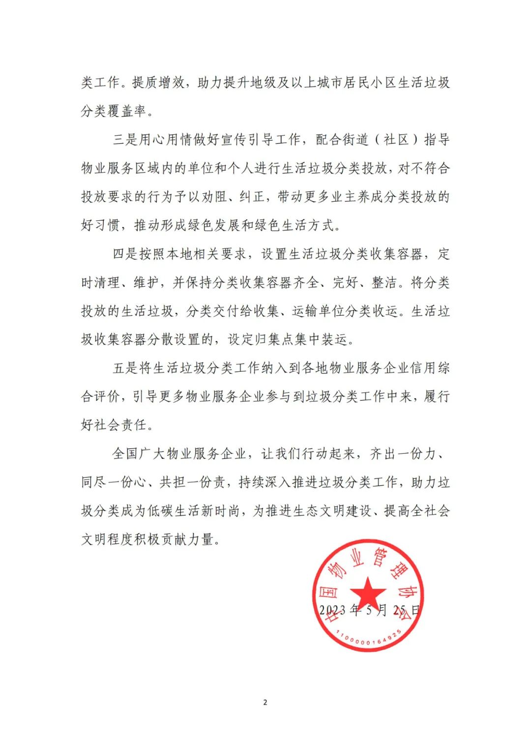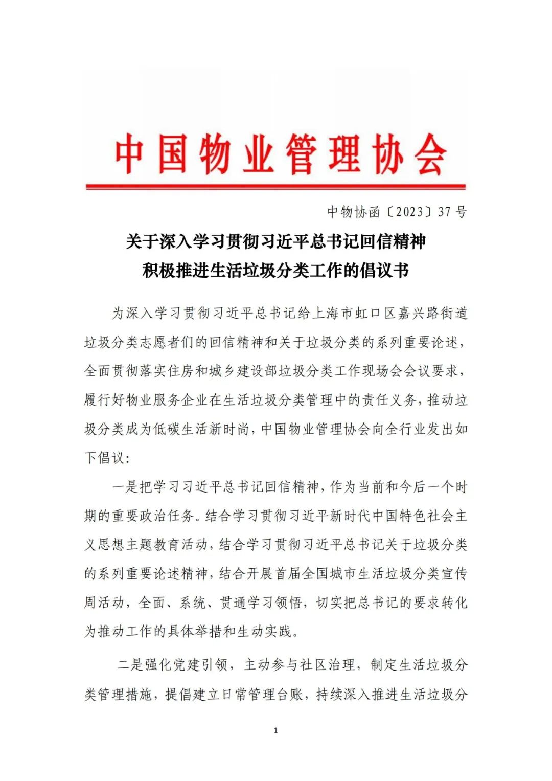 中国物业管理协会关于深入学习贯彻习近平总书记回信精神 积极推进生活垃圾分类工作的倡议书