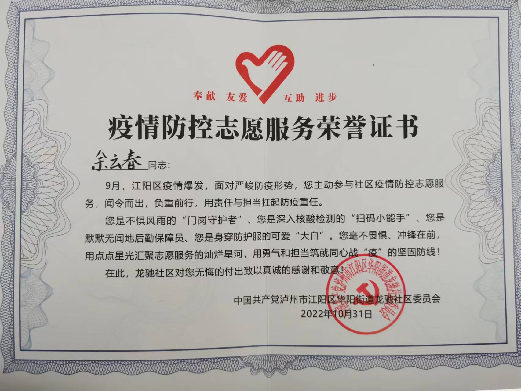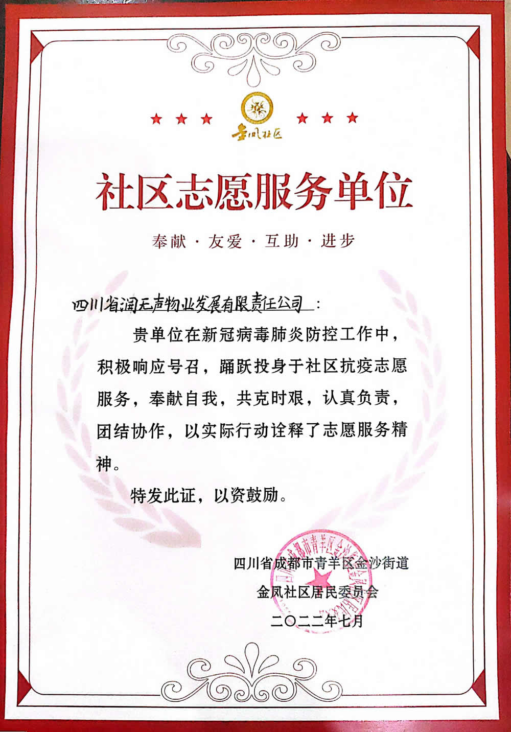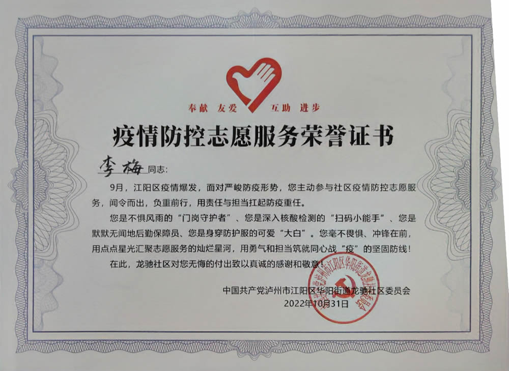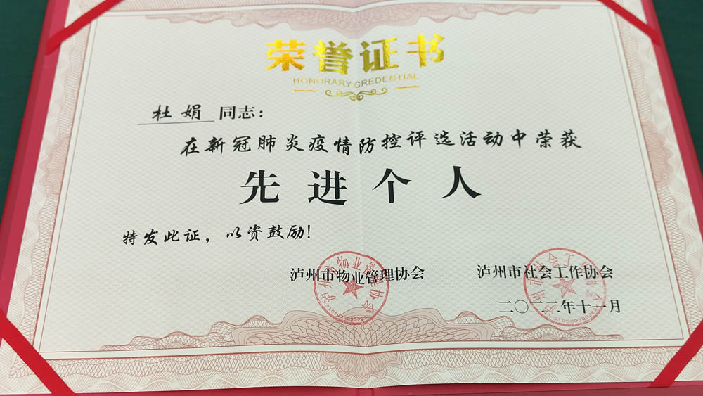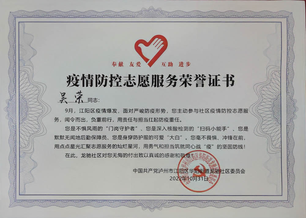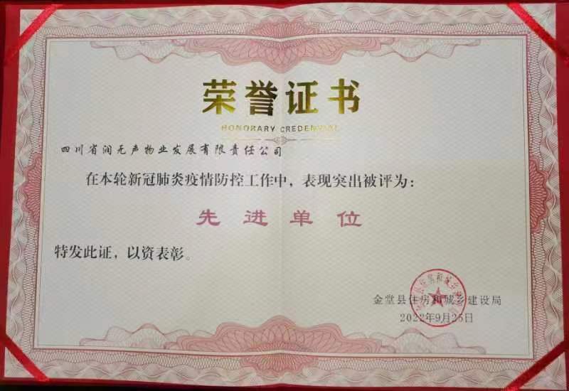 2022年,疫情面前润家人没有退缩,始终紧守在防控一线,为业主筑起一道坚固的防线,泸州、温江、金堂分公司获得疫情防控先进集体,谢玉刚、吴荣、王静、谯明辉、余云春、杜娟等公司同仁获得疫情防控先进个人及志愿者服务荣誉证书。